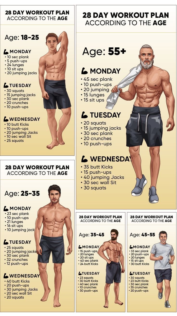 This easy-to-follow chart provides a 28-day workout plan tailored to different age groups. Each routine balances strength, endurance, and mobility exercises appropriate for your life stage.