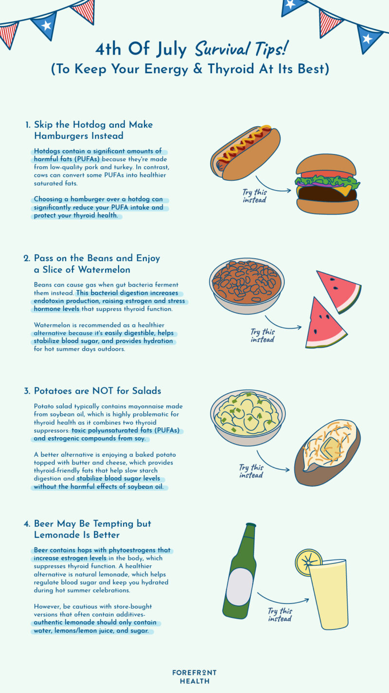 You can enjoy a happy and healthy 4th of July celebration by following these four simple yet practical thyroid diet tips. First, choose hamburgers over hotdogs since hotdogs contain significant polyunsaturated fats (PUFAs) that block thyroid function and your entire Thyroid Hormone Pathway. Second, skip the baked beans which can increase estrogen that suppresses thyroid activity, and opt for thyroid-friendly watermelon instead. Third, avoid potato salad made with store-bought mayonnaise (which contains thyroid-suppressive soybean oil) and choose a baked potato with butter and cheese instead. Finally, drink homemade lemonade rather than beer, as beer contains hops with phytoestrogens that increase thyroid-suppressive estrogen in the body. Following these simple food swaps allows you to make the most of your summer holiday gatherings without having to compromise your thyroid health.
