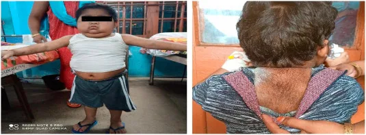 A 4 years old boy presented with complaints of excessive weight gain of 5 months duration and increase frequency of micturition and appearance of body hair for 4 months. There was no history of any other illness, medication or steroid intake. The child was first born at term by normal vaginal delivery and birth weight of 3 kg. Physical examination revealed a chubby boy with moon face, buffalo hump, protruding abdomen, increase body hair and appearance of coarse pubic hair (Fig. 1). His intelligent quotient (IQ) was appropriate for his age and sex. His younger sibling was in good health and other family members did not have any metabolic or similar problems.