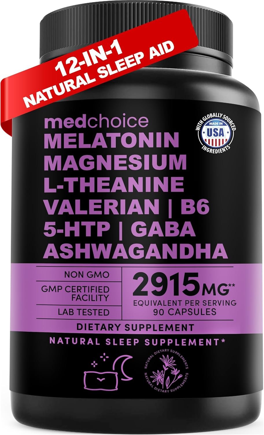 12-in-1 Melatonin Sleep Capsules – Natural Sleep Aids for Adults with Melatonin 5mg and Magnesium Glycinate 500mg, Sleep Aid with Ashwagandha, L Theanine, Valerian Root, GABA, 5-HTP (90ct, Pack of 1)