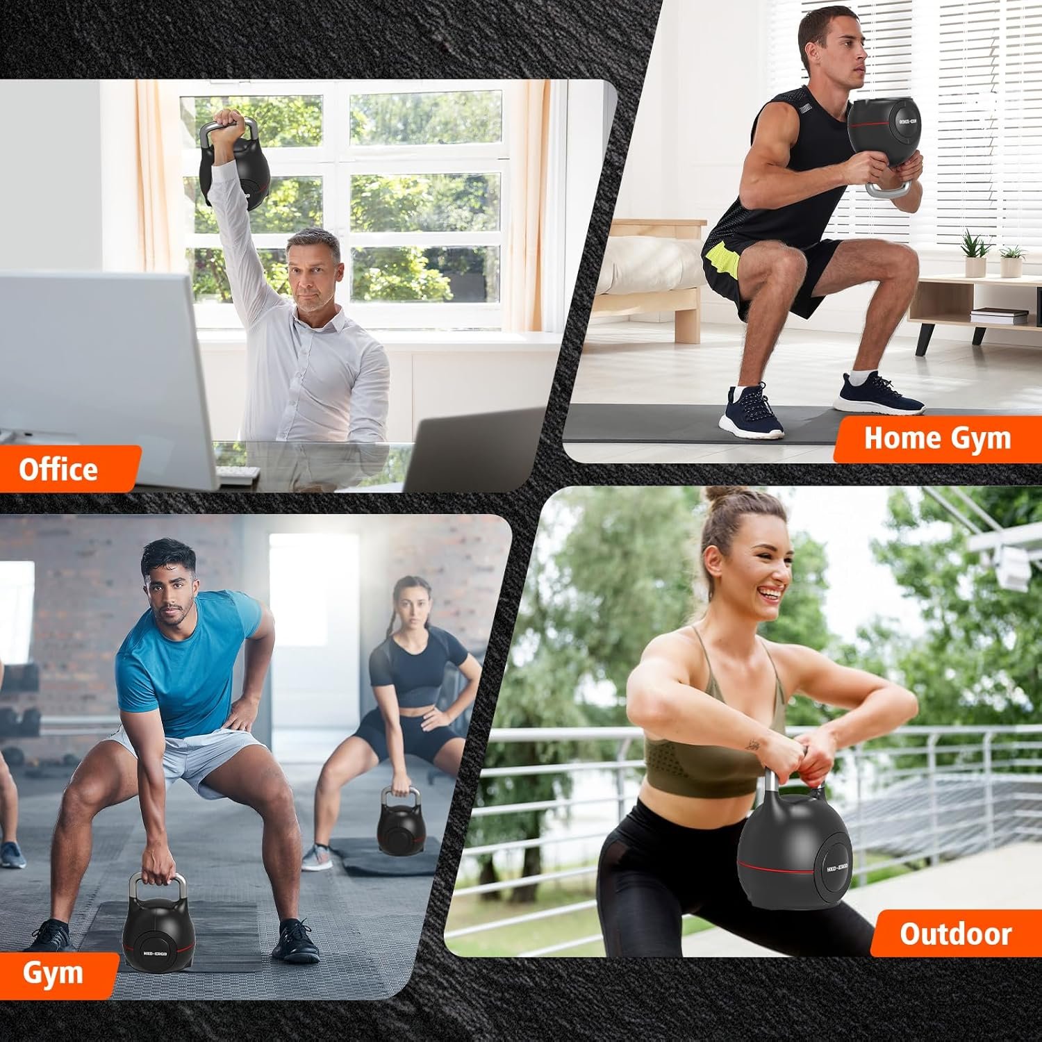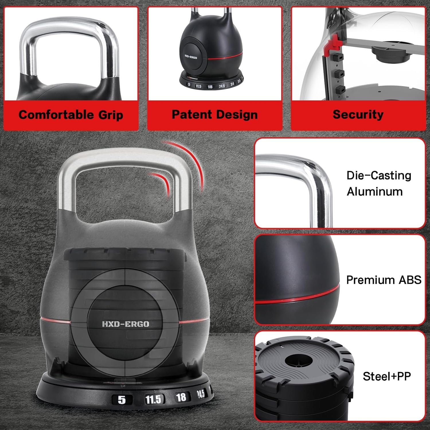 7-in-1 Adjustable Weights Design:HXD-ERGO Adjustable Kettlebell offers 7 weights (5-44 lbs) in one unit, providing flexibility and space efficiency. Whether at home or in the gym, it helps you target your fitness goals without the need for multiple kettlebells.