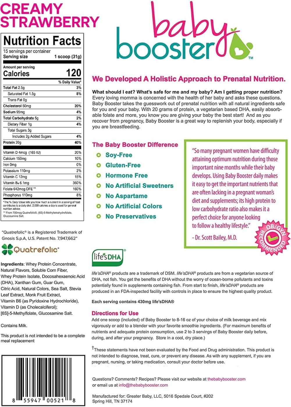 Baby Booster Pregnancy Protein Powder Vitamin Supplement Shake – OB/GYN Approved Prenatal & Postnatal Lactation Use – Morning Sickness Relief with Vegan DHA and Methyl Folate – Creamy Strawberry, 1 lb