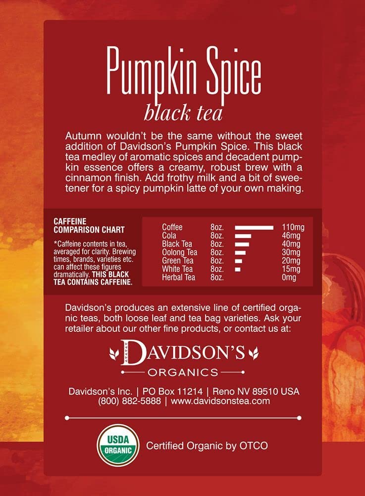Pumpkin Spice is a medley of robust spices and decadent pumpkin essence with a base of organic black tea. Davidson’s Pumpkin Spice is a full-bodied black tea brew with creamy, pumpkin undertones and spicy top notes.