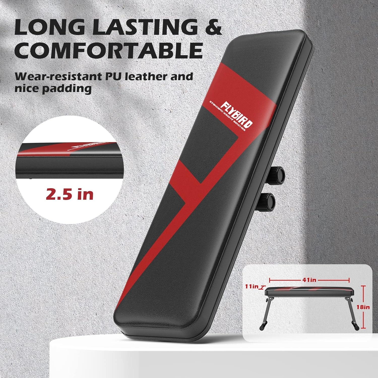 【Foldable to Store】FLYBIRD Flat Workout Bench can be easily folded with 1 knob & 1 pin on each side. You can fold it up against a wall or under a bed when you’re not using it. The size of the cushion is 41*11 inches and the bench is 5.7 inches high when folded flat. Perfect for any small home gym space.
