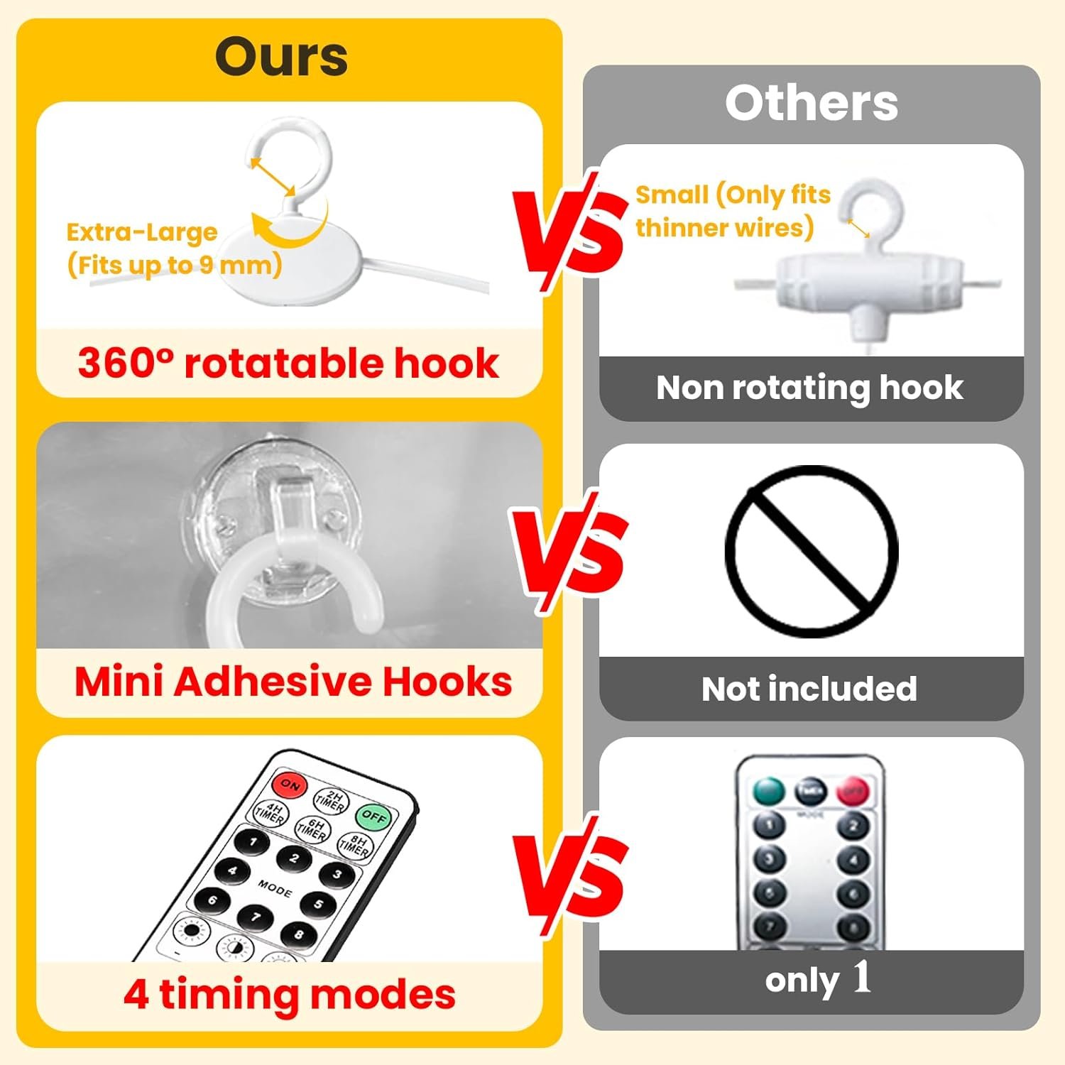 360°Rotatable Hooks: Upgrade 360°Rotation Clips on each drop string is mainly used for hooking on curtains; It can be hung at any angle, such as on wall, window or other surface; Also includes 16 sets of Damage-free adhesive hooks; No nails needed and holds strongly and removes cleanly; Both of these two clips make the curtain light easily to be hung for some special places, not only limited to windows, but also can be hung on flat walls, glass, porches, eaves, etc